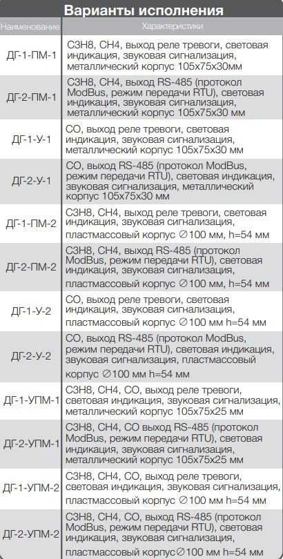 Шлейф передачи извещения “Тревога” (ДГ-1) или RS-485 (ДГ-2) Время срабатывания аварийной сигнализации после изменения содержания определяемого компонента на входе сигнализатора по каналу CH4 и C3H8 – не более 10 секунд, по каналу CO – не более 50 секунд. Среднее время наработки на отказ сигнализаторов в дежурном режиме, не менее 15 000 часо